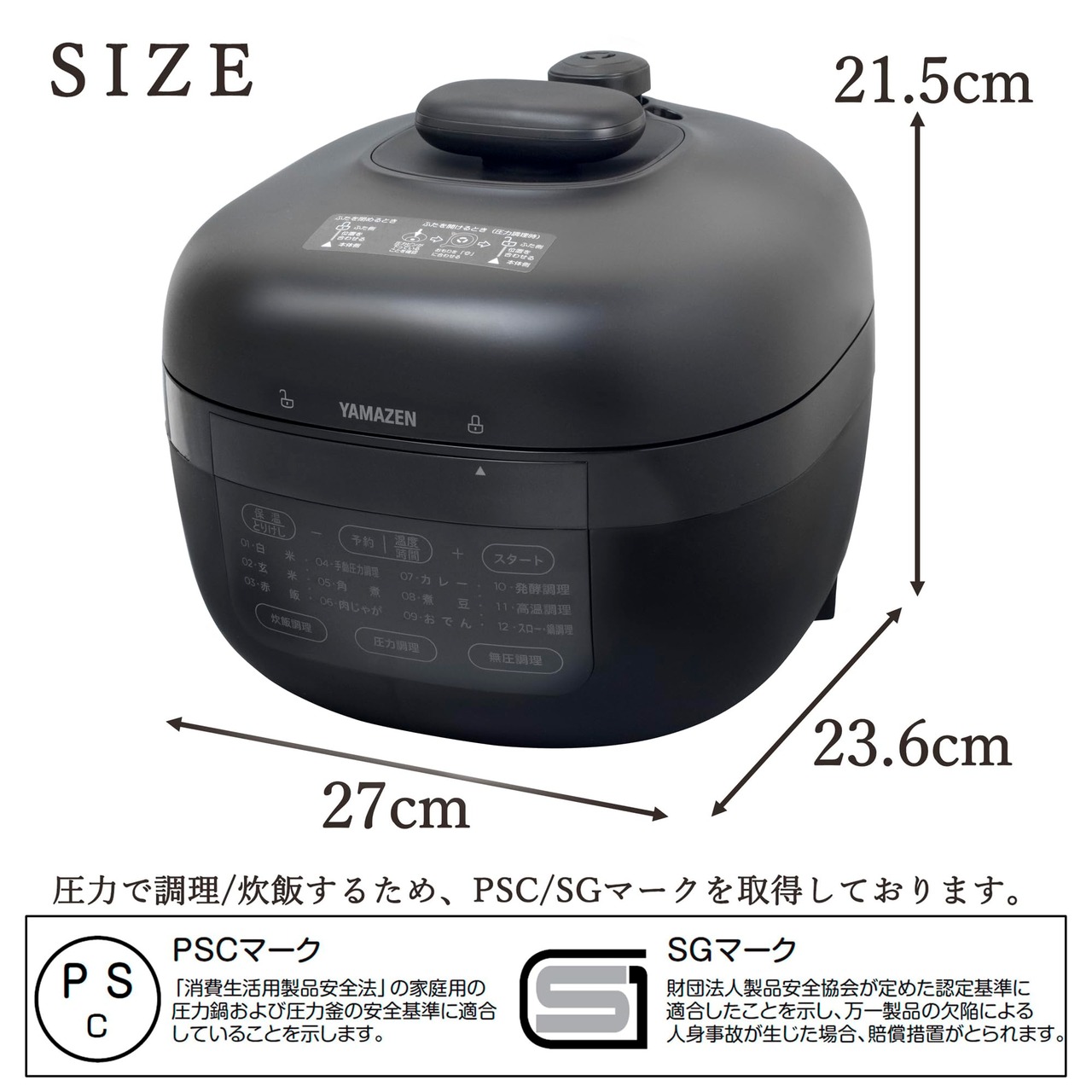 【商品詳細】◇本体サイズ:幅27×奥行23.6×高さ21.5cm ◇本体重量:3.6kg ◇満水容量:2.2L ◇調理容量:1.4L ◇炊飯容量(白米):3合 ◇最高圧力:70kPa ◇電源コードの長さ:1.0m ◇保証期間:お買い上げ日より1年間(保証の範囲については、取扱説明書をご確認ください。(一般家庭用以外(業務用など)に使用された場合の故障及び損傷などは保証対象外となります))