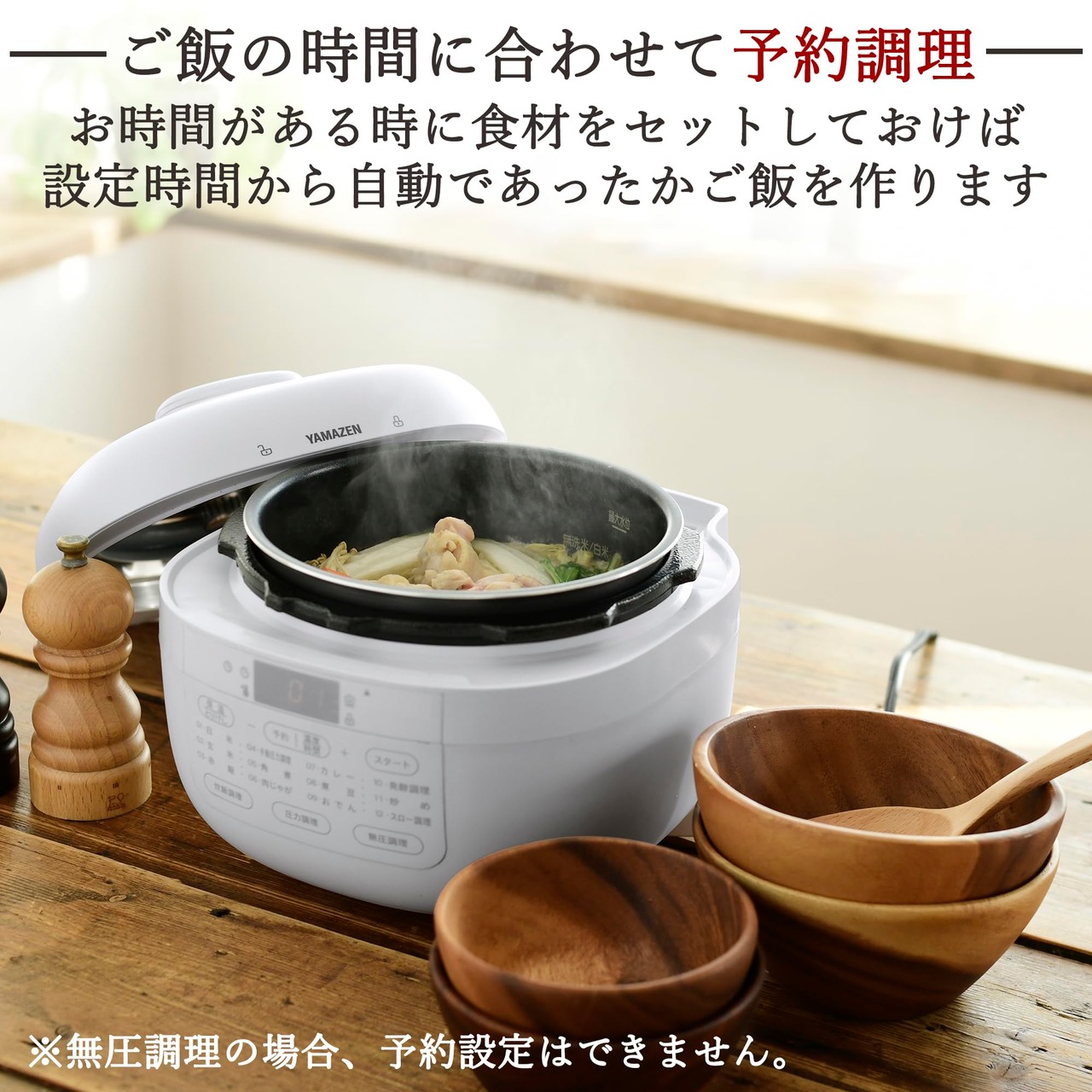【圧力・予約設定】お好みで圧力5段階、利用シーンに応じて調理開始時間の予約が0.5~24時間の間で設定できます。お時間がある時にサッと具材をセットしておけば、いつでもできたて美味しいご飯の出来上がりです。※無圧調理の場合は予約設定ができません。