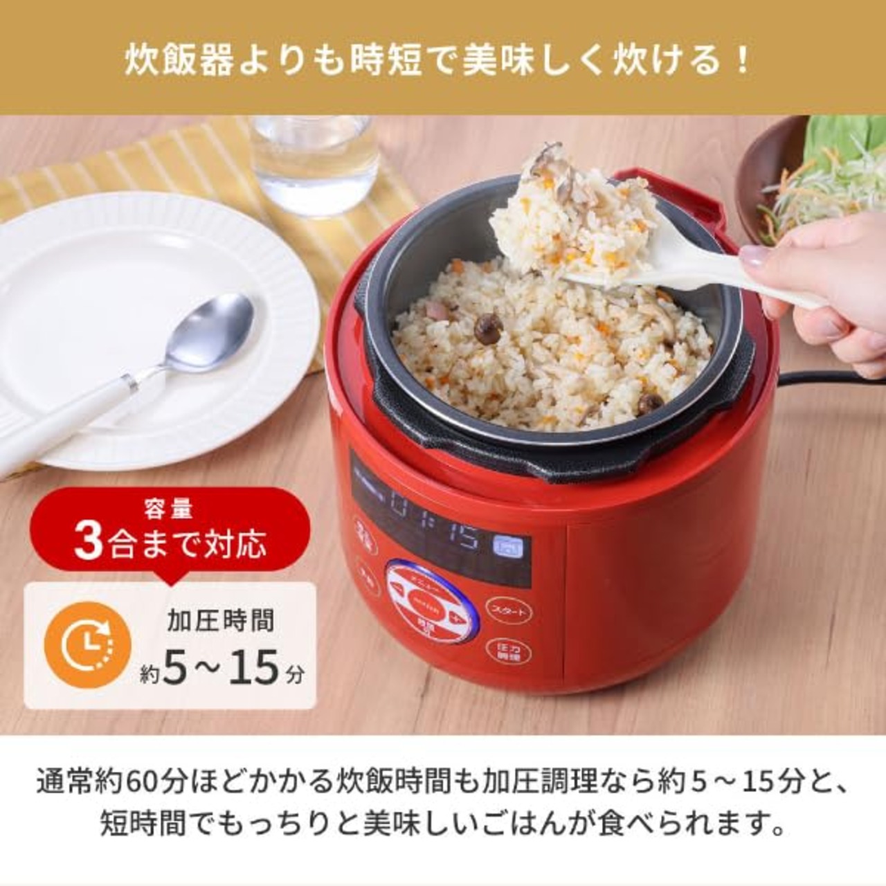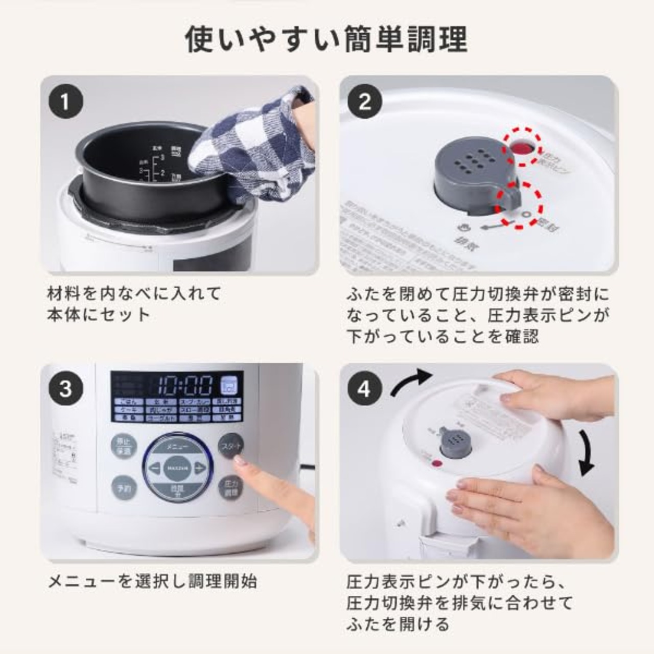 多機能で便利。1台6役だから、お料理のバリエーションが広がる。 圧力調理: 自由な時間設定で、お好みに合わせて調理できます。 スロー調理: 沸騰させないので煮崩れせずに食材をやわらかく調理 予約: 生活シーンに合わせて調理時間の予約ができます。 蒸し料理: 無圧で蒸し料理が簡単にできます。 加熱: あたため直しができるので、いつでもほかほかの食事が楽しめます。 ヨーグルト: ヨーグルトやパンのタネ作りなどができます。