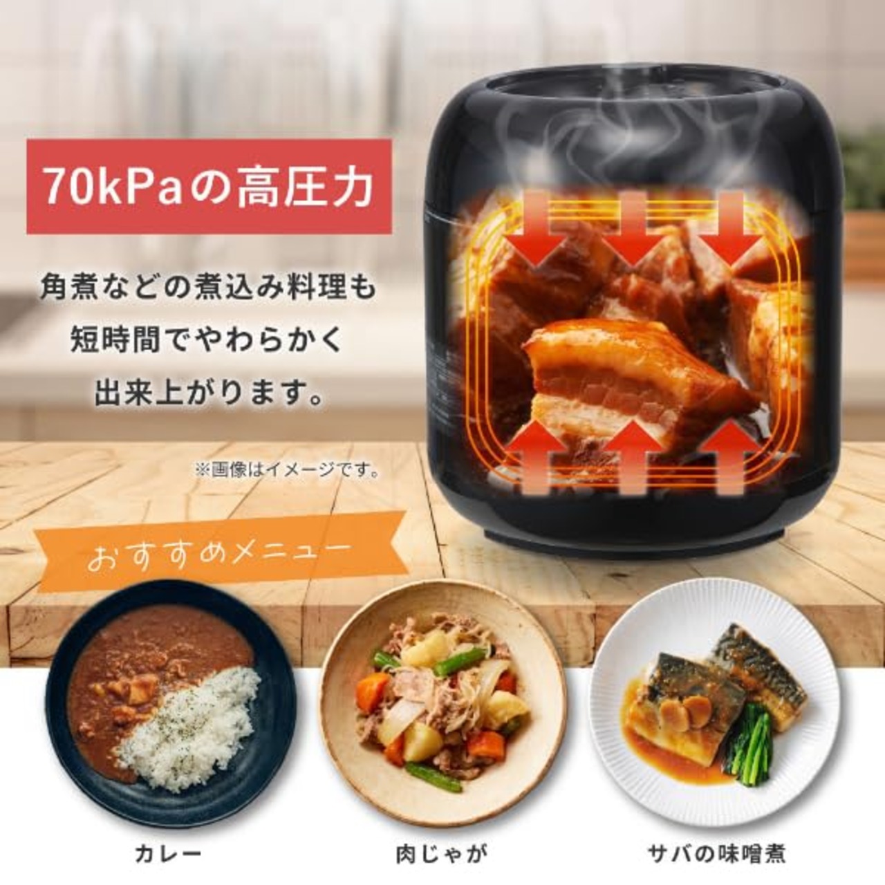 70kPaの高圧力。角煮などの煮込み料理も短時間でやわらかく出来上がります。