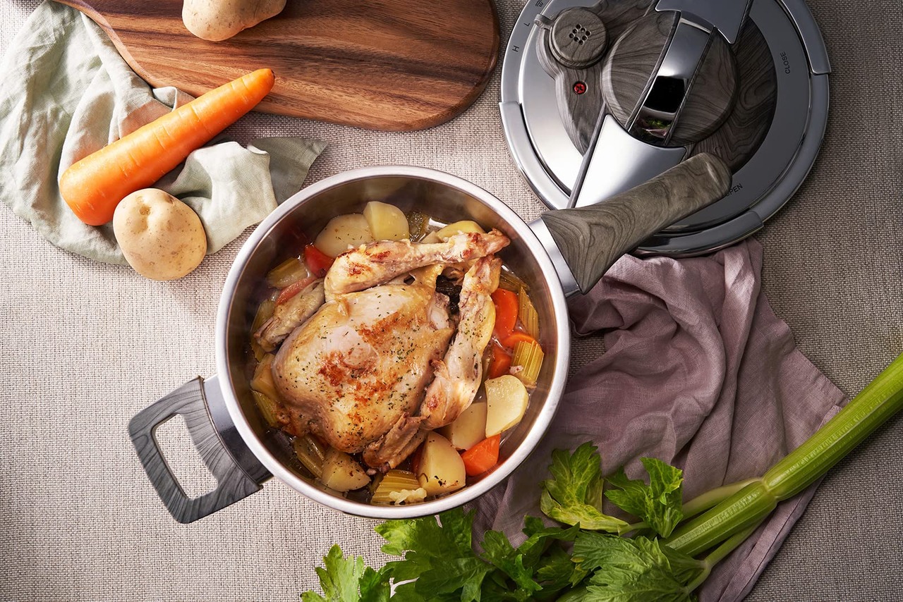 蓋が使いやすくて便利な圧力鍋。取っ手を回すだけで簡単に開閉できます。