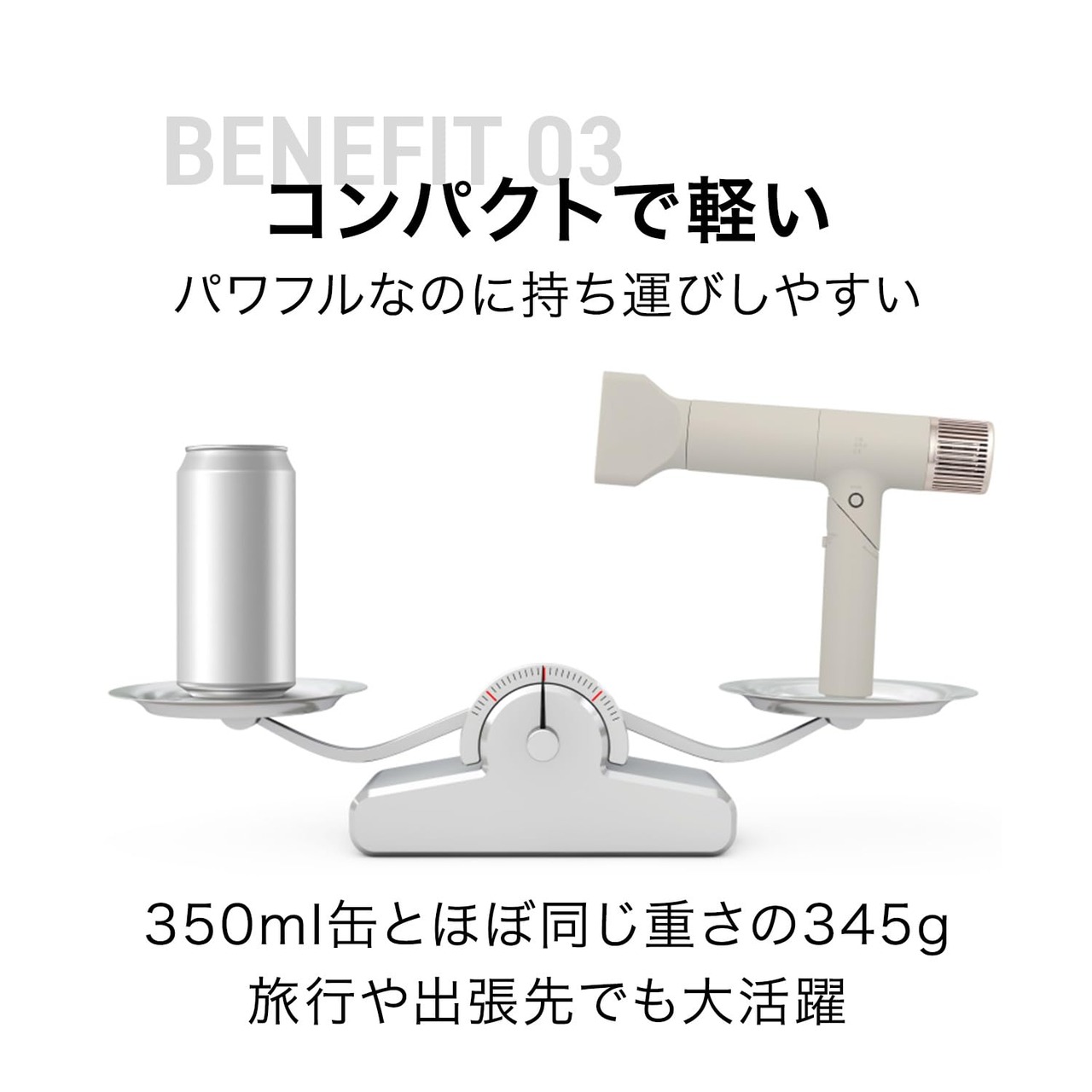 「この軽さで、驚きの速さ。」 重さ約345g。 熱を抑え、髪を守るGLOSSYモード搭載。 Velenaが叶えるのは、髪にも、時間にも優雅な余裕。