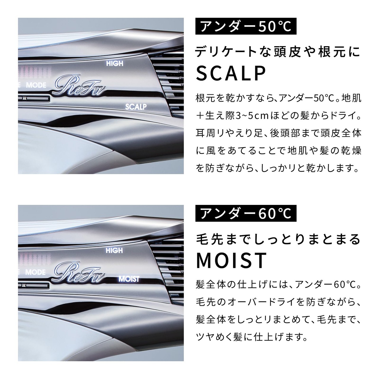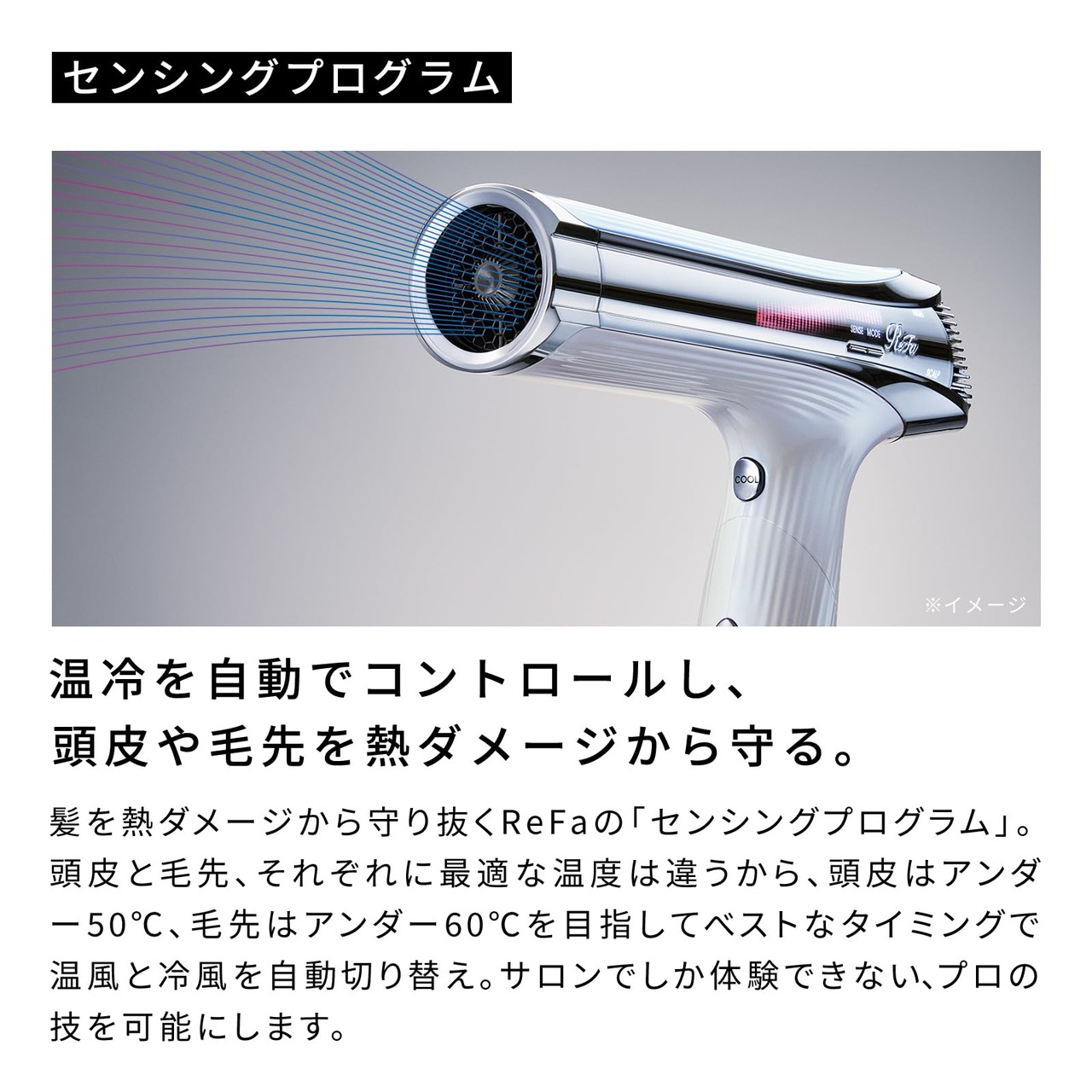 【温冷を自動でコントロールし、頭皮や毛先を熱ダメージから守る】髪を熱ダメージから守り抜くReFaの「センシングプログラム」。頭皮と毛先、それぞれに最適な温度は違うから、頭皮はアンダー50°C、毛先はアンダー60°Cを目指してベストなタイミングで温風と冷風を自走切り替え。サロンでしか体験できない、プロの技を可能にします