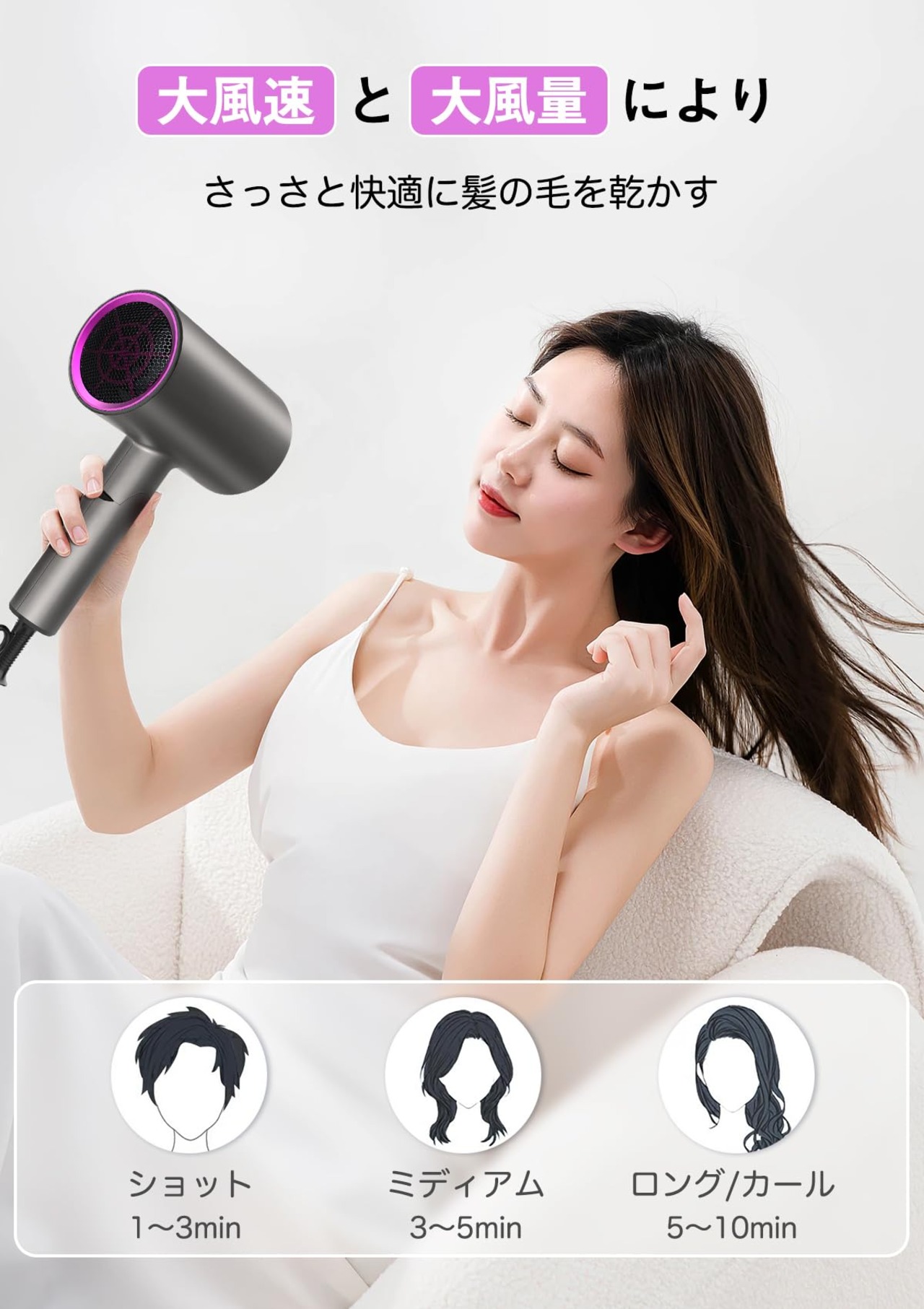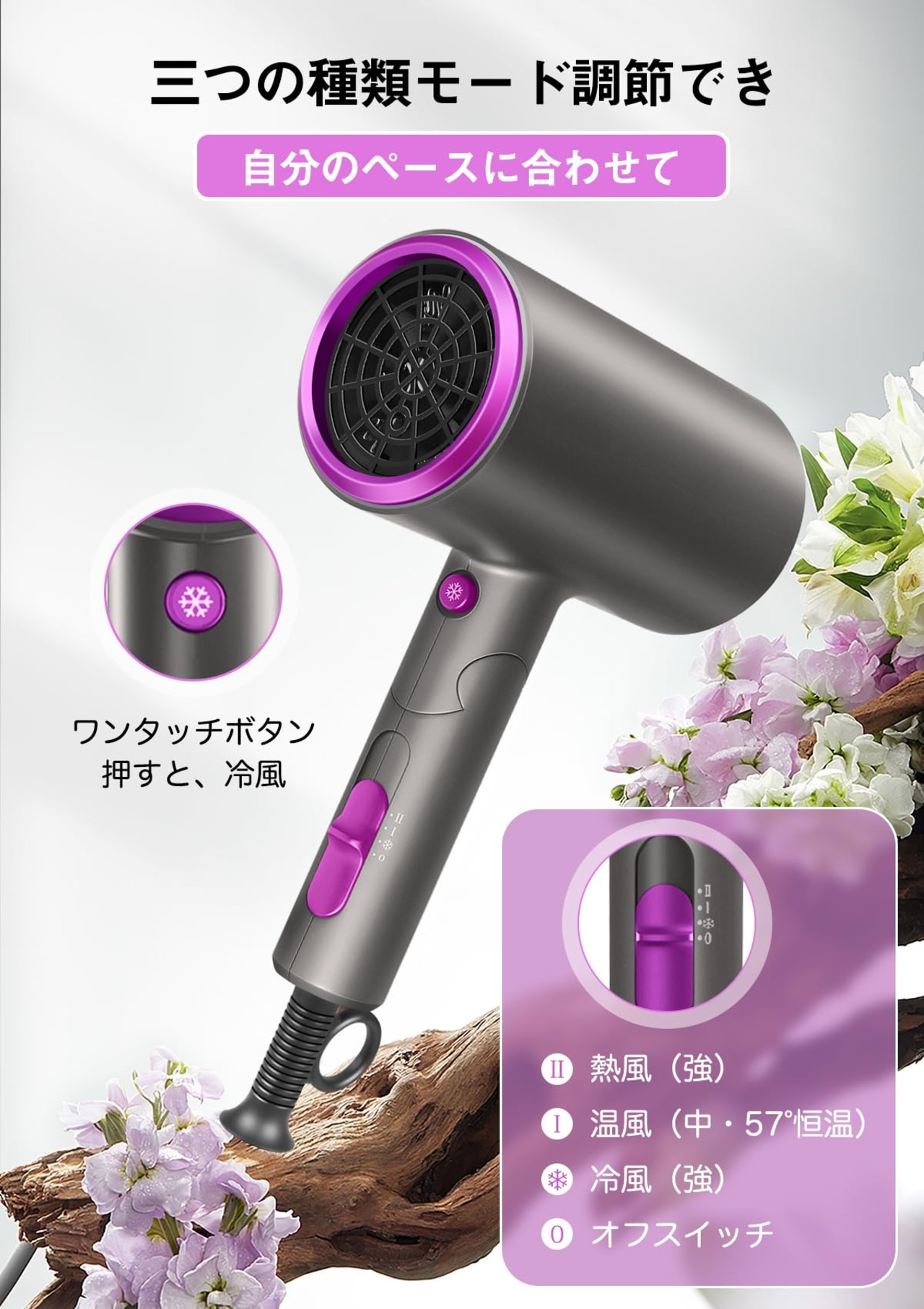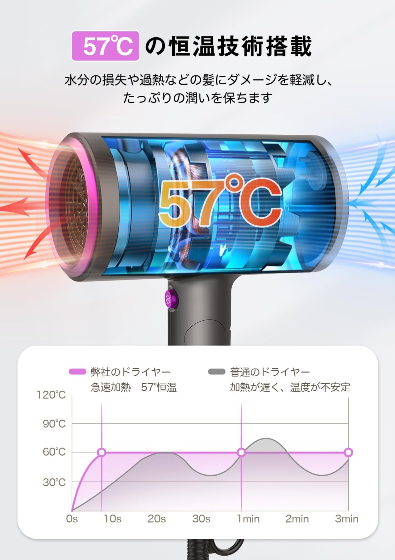 【熱風温風冷風自由に切替】ドライヤーは普通のドライヤーと違って、このヘアドライヤーは単なるの冷熱風だけではなく、様々な要求にそれぞれのモードを選択できます:【速乾モード】:熱風+大風量→髪を早く乾きたい方に適用、【ヘアケアモード】:57℃恒温+中風量→髪質を向上したい方に適用、【スタイリングモード】:冷風+大風量→付属品の吹き出し口のアタッチメントに合わせてお好きなスタイルを作ることができます。温度過昇防止装置が搭載され、温度が高すぎになったら電源が自動にオフになり、安全だし使いやすいです。