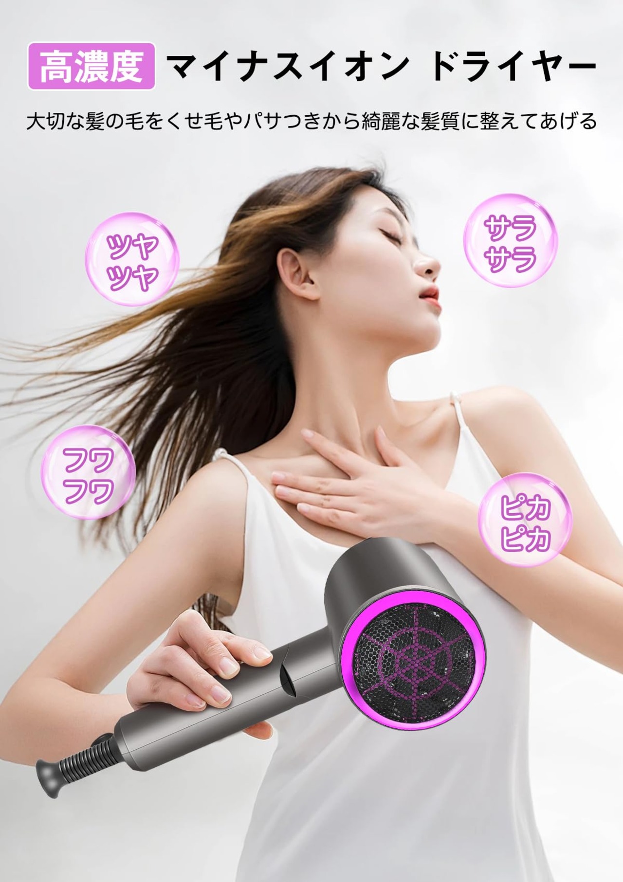 【豊富なマイナスイオン、滑らかな髪質に】ヘアドライヤーは2000万マイナスイオンが放出させ、髪にある正電荷をすみやかに中和し、静電気の発生を最大限に抑え、パサついた髪に潤いを与えます。長期間に使用されると、髪の光沢となめらかさを感じられるようになります。