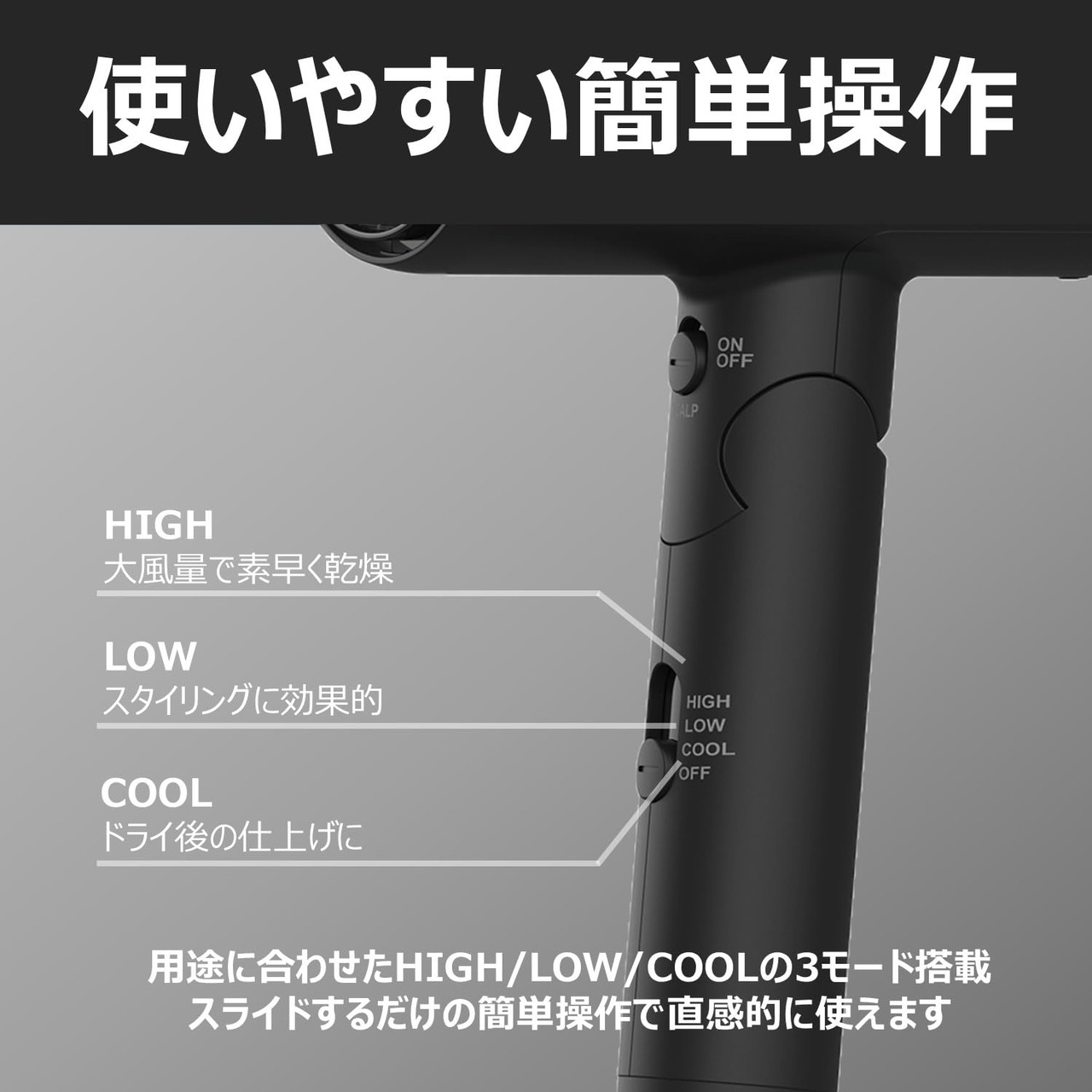 【Amazon.co.jp限定】 コイズミ ヘアドライヤー モノクローム 大風量 速乾 低温風モード 折りたたみ マイナスイオン ブラック KHD-9532/BK