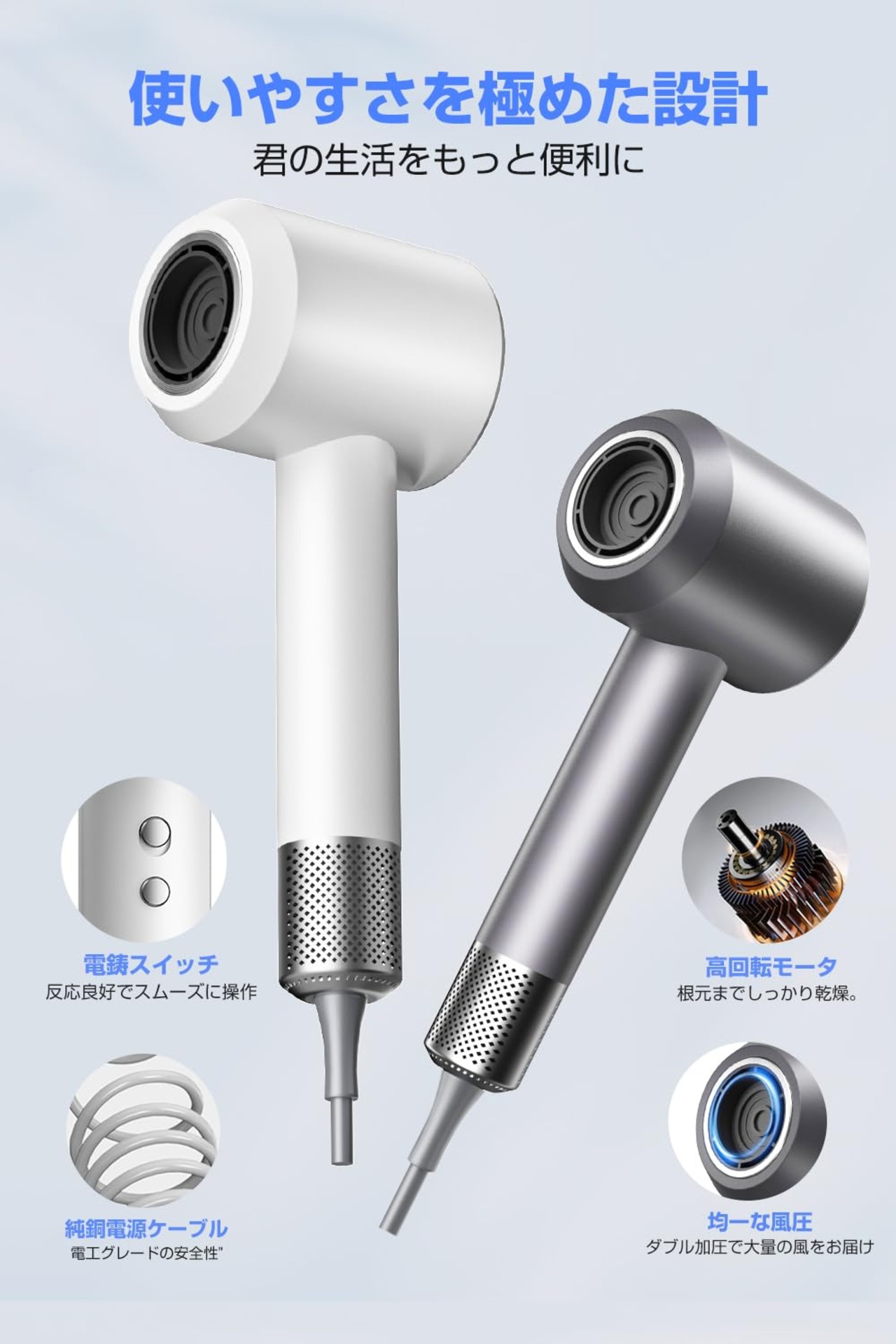 【斬新デザイン・3億マイナスイオン・ワンタッチ冷風】 ドライヤー ヘアドライヤー 1300W超大風量 速乾 ブラシレスDCモーター 温冷風ワンタッチ切替 美髪 ヘアケア NTC温度制御システム 過熱防止 軽量 低騒音 持ち運び便利 3億高濃度マイナスイオン 静電気除去 美容師監修 ヘアサロン/家庭用 PSE認証済み 日本語説明書/マグネティックノズル付き (ホワイト)