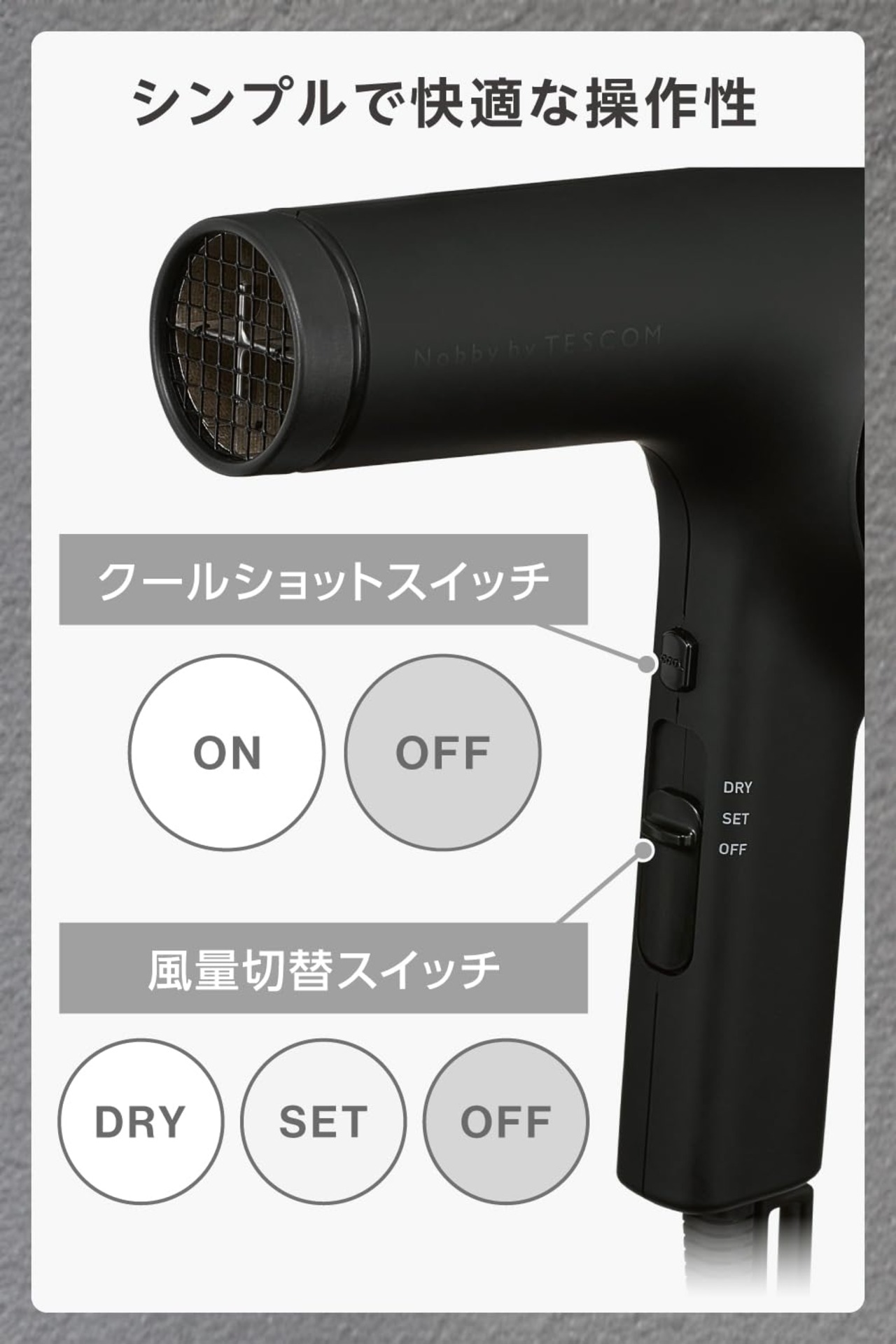 <b>【 仕様 】</b><br>■外形寸法:幅約205mm×奥行約82mm×高さ約194mm(本体のみ)<br>■質量:約425g(本体のみ)、約450g(セットフード付き)<br>■消費電力:1200W<br>■付属品:セットフード(ブロータイプ)<br>■電源:AC100V 50/60Hz<br>■スイッチ:風量切替スイッチ DRY/SET/OFF、クールショットスイッチ ON/OFF<br>■折りたたみ:×<br>■温風温度:115℃(周囲温度30℃の場合、DRY-HOT時)<br>■搭載イオン:プロテクトイオン<br>■ラク抜きプラグ:○<br>■海外使用:×<br>■カラー:ブラック<br>■コード長:1.7m<br>■パーツ:フィルター(GMT00028-01)、フィルターカバー(GMT00025-01)、フード(ZMT00002-01)<br>■保証期間:2年間<br><br><b>【 説明 】</b><br>■テスコムのサロン専用ブランド『Nobby』から生まれたNobby by TESCOM。洗練されたデザインとともに、「私にできる、サロンクオリティ」をコンセプトにプロの技をご自宅でリアルに再現できる機能を搭載しました。<br>■ミニマムな機能でヘアドライを快適にします。温風と冷風をワンタッチで切り替えるクールショットスイッチは、グリップを握ったときに押しやすい位置に設定。風量切替スイッチもシンプルな操作性。<br>■当社従来機種より約22%(※)の小型化と約19%(※)の軽量化を実現。 大幅に軽量・小型化しながらも風速は34%(※)アップ。 持ちやすく乾かしやすい、軽量ドライヤーです。 ※NIB300Aとの比較<br>■乾燥や髪摩擦による静電気の発生が、ドライヤーの課題。テスコム独自のプロテクトイオンは静電気を抑制し、ワンランク上の美髪に導きます。<br>■美しさを印象付ける大きな要素が “髪のツヤ”プロテクトイオンは髪のツヤめきを19%UPします。<br>■※試験方法:(HOT/DRY)で送風し、300回ブラッシング後のツヤ指数の比較。当社調べ。<br>■髪の広がりを抑えてまとまる、 扱いやすい髪へ導きます。<br>■※試験方法:縮毛毛束に手ぐしをしながら(HOT/DRY)で4分30秒、(COOL/SET)で30秒送風後のまとまり指数の比較。当社調べ。<br>■枝毛や切れ毛を約46%抑制、髪の表面が整うことで、枝毛や切れ毛ができにくい髪へ。<br>■※試験方法:(HOT/DRY)で送風しながら1000回ブラッシングした後の枝毛・切れ毛の発生率の比較。当社調べ。<br>■セルフブローをサポートするセットフード(※)。ブロー時にフードの先端がブラシに固定しやすい、 オリジナルデザインです。<br>■※使用中・使用後は高温のためさわらないでください。樹脂製のブラシを使用してください。(耐熱温度120℃以上のブラシを推奨します。獣毛や木製・金属製のブラシは使用できません。)フードをブラシに強く押し当てると、ピンが変形する恐れがあります。<br>■従来のフィルターに比べ耐久性の高いフィルターを採用。お手入れがしやすく水洗いも簡単に行えます。<br>■レバーを押すだけで簡単にプラグを抜くことができます。力の弱い方やお年寄り、爪の長い方やネイルをしている方でも、プラグを楽にコンセントから抜くことができます。<br>■業務用の高い設計基準で安心の2年保証。 ※業務用で使用された場合の故障は、保証期間内であっても有料修理となります。<br>■信頼の日本製。 ※2024年11月下旬より順次切替予定。<br><br><b>【商品に関するお問い合わせ】</b><br>ホームページよりご確認ください