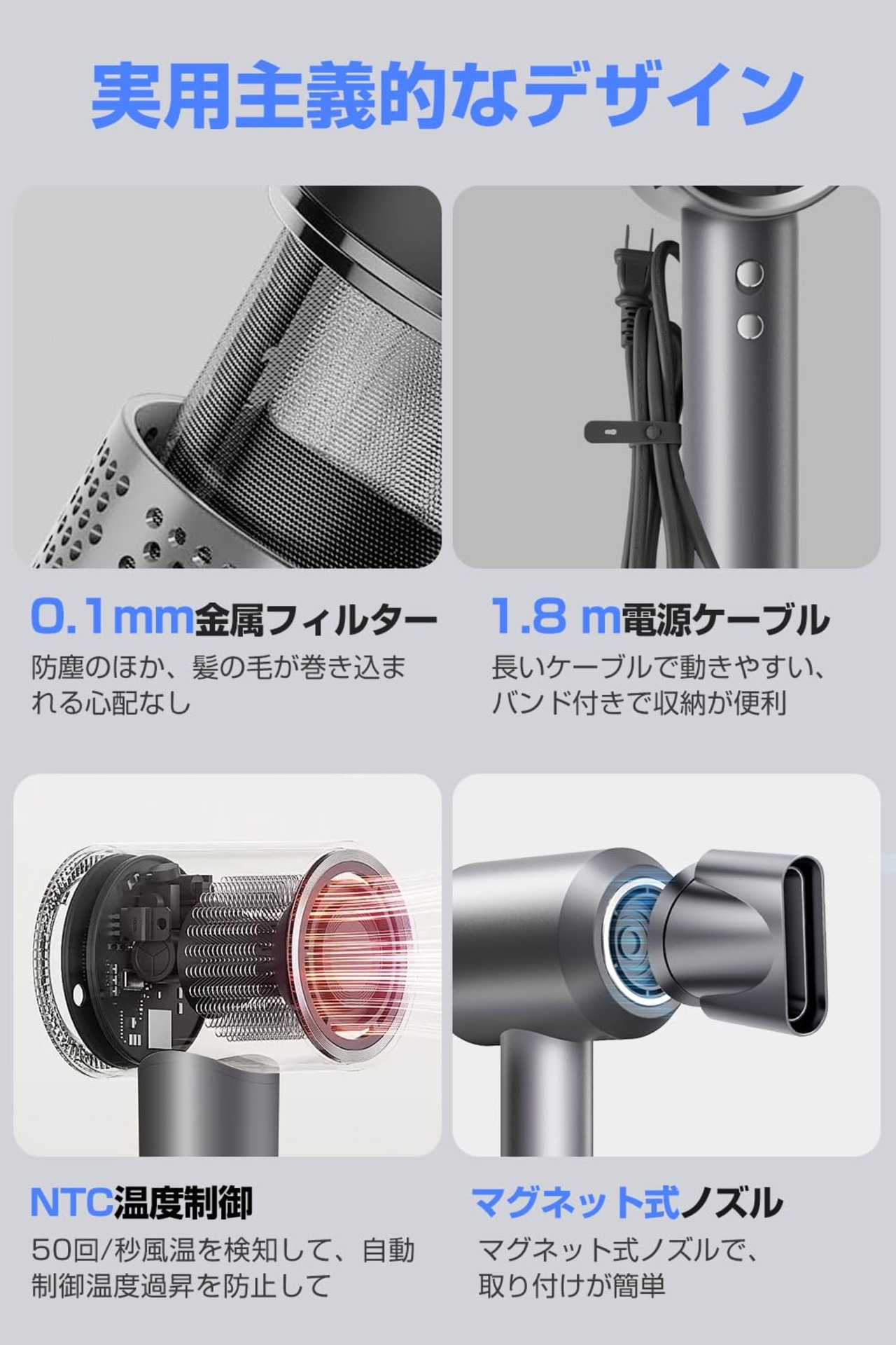【斬新デザイン・3億マイナスイオン・ワンタッチ冷風】 ドライヤー ヘアドライヤー 1300W超大風量 速乾 ブラシレスDCモーター 温冷風ワンタッチ切替 美髪 ヘアケア NTC温度制御システム 過熱防止 軽量 低騒音 持ち運び便利 3億高濃度マイナスイオン 静電気除去 美容師監修 ヘアサロン/家庭用/旅行用 PSE認証済み 日本語説明書/マグネティックノズル付き (グレー)