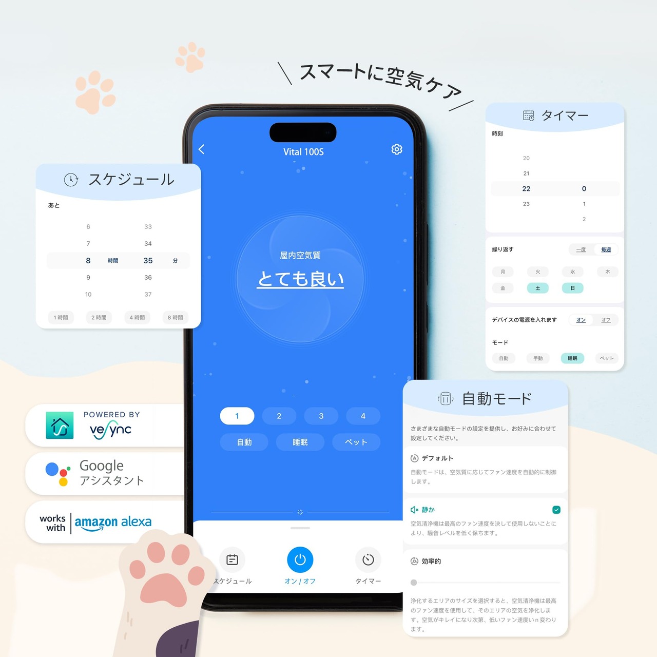【スマホ対応、ペットモードも搭載】①無料な専用アプリVeSyncとスマートスピーカーとの連携で、電源オン/オフやモードの切り替え、タイマーやスケジュールの設定などが、わざわざその場から動かずに簡単に操作できます。②また、ペットモードもアプリに搭載されており、強と弱モードの間で切り替える運転で、気になるペット臭を素早く消臭でき、ペットとの暮らしがより快適になります。