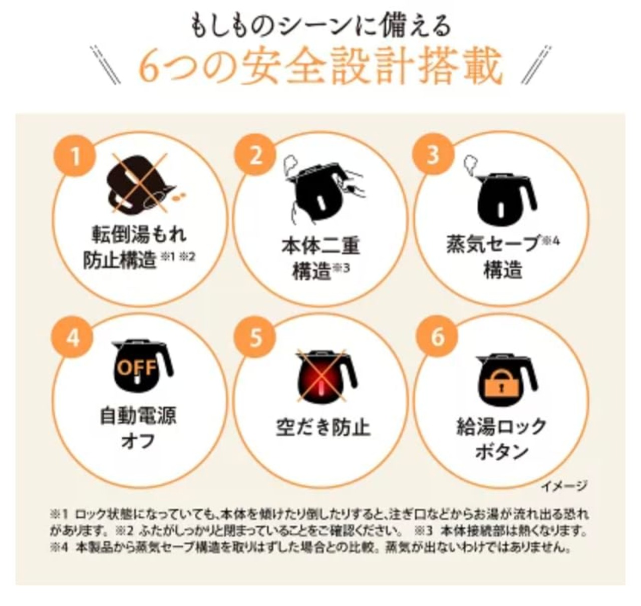 シンプル機能でベーシックな電気ケトル。ベーシックながらも6つの安全設計を搭載しており、使いやすさと安全性を兼ね備 えています。