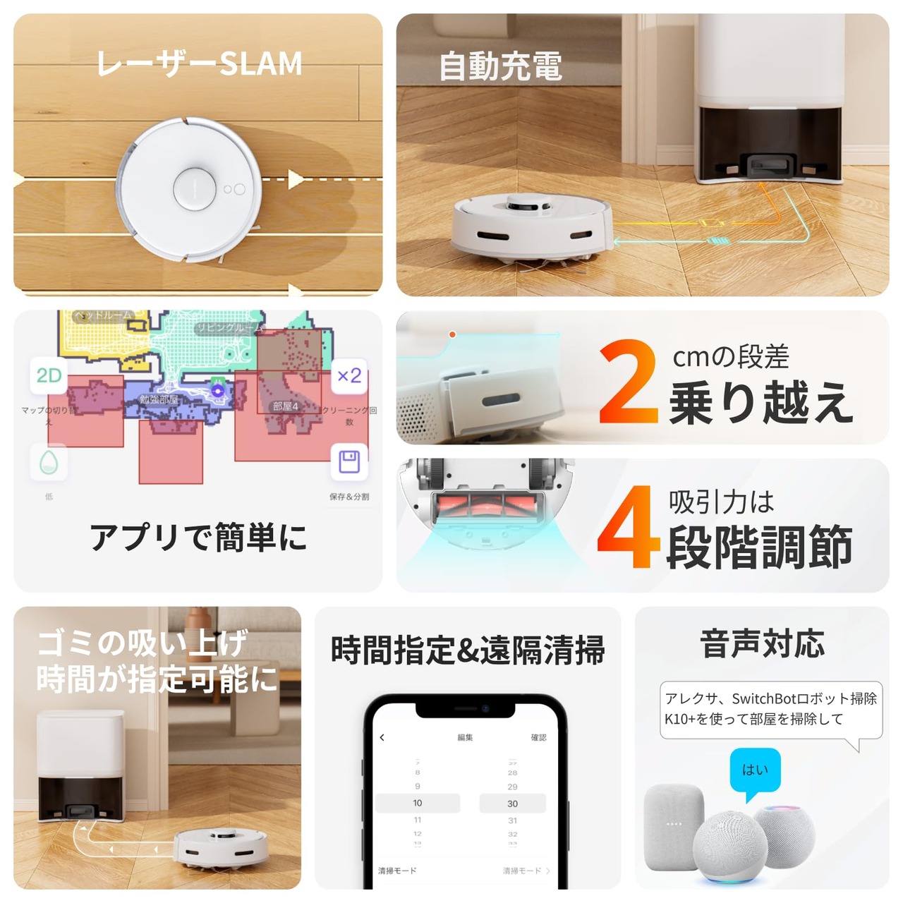 【超小型】SwitchBot ロボット掃除機 K10+ 90日間自動ゴミ収集 高精度マッピング 2500pa強力吸引 水拭き 禁止エリア 静音設計 遠隔操作 自動充電 落下防止 2.4GWi-Fi対応 Alexa Google Home IFTTT Siriに対応