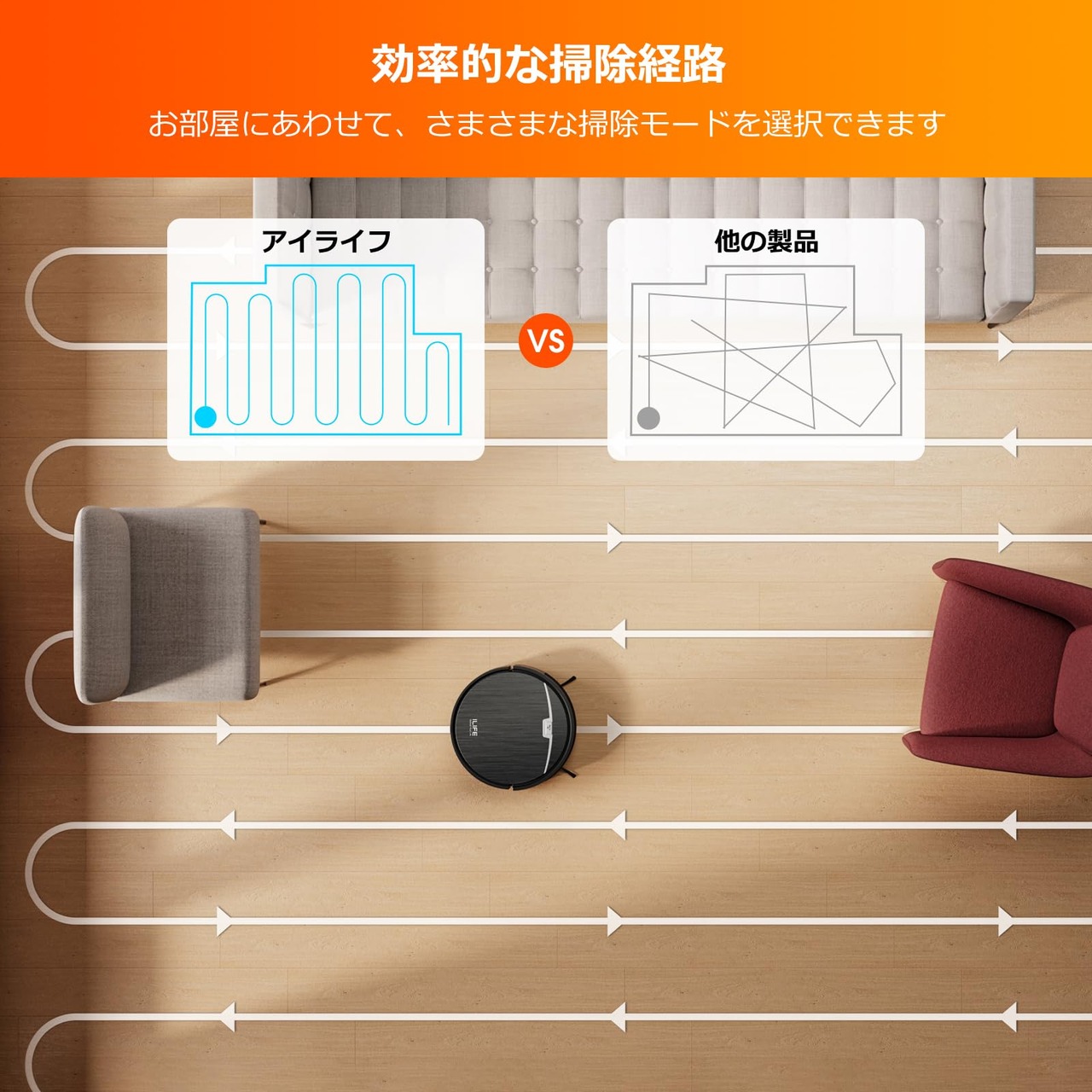 【吸引掃除と水拭きを1台で対応】ILIFE V9Proは吸引掃除に加え、水拭き掃除も一度におこなってくれるロボット掃除機です。吸引掃除だけでは取り残してしまう微細なホコリや、 床に張り付いた汚れなどを一度に除去。※ご自宅にカーペットがある場合、モップ機能を使用する際はモップとモップスタンドを取り外す必要があります。
