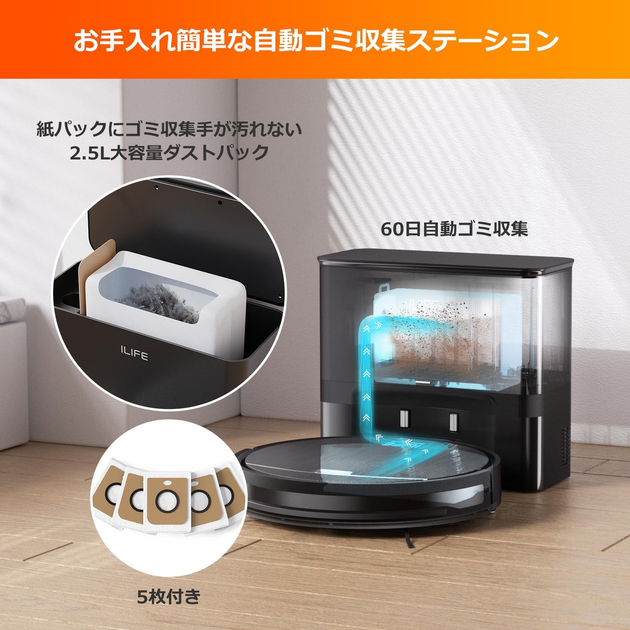 【自動ゴミ収集ステーション】2.5L*5の紙パックで、60*5日分のゴミを収集。購入時には、紙パック5枚が付属します。大容量の紙パックは、最長60日*5間使用でき、ごみ捨て不要で掃除を行えます。掃除が終わるたびにお手入れしないといけないというストレスを完全解消します。※部屋の環境などにより、収集できる日数は変わります。