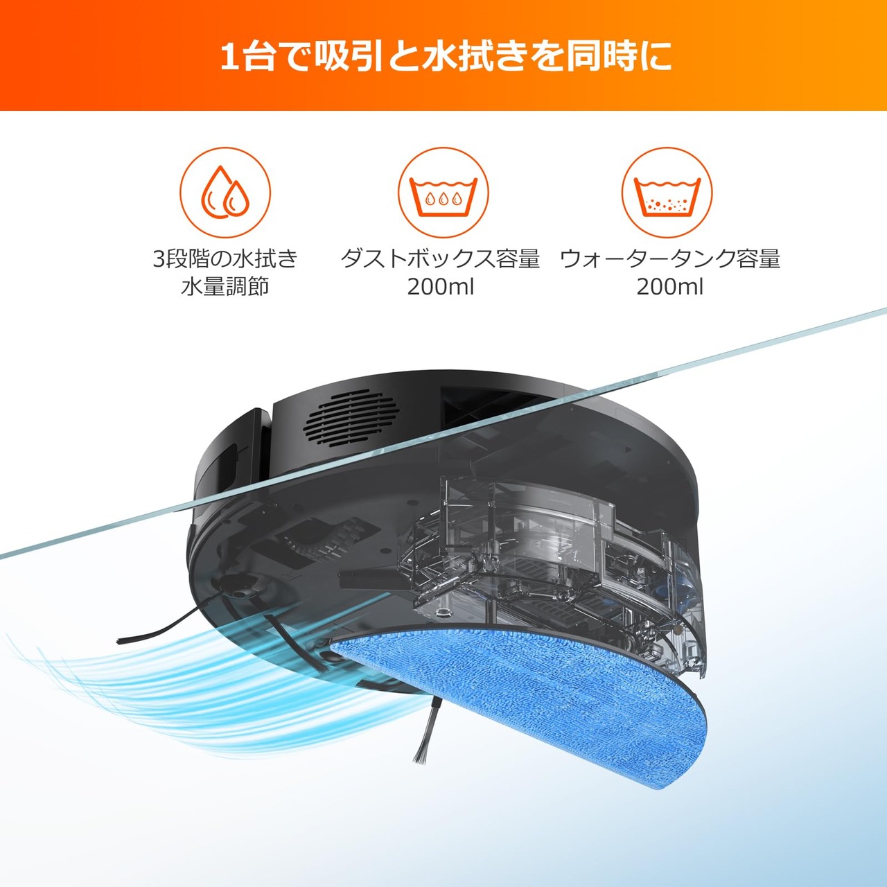 【2in1 ダストボックス&ウォータータンク】V9 Proロボット掃除機には、200mlダストボックスと200mlウォータータンクの2in1が付属しているため、モードを切り替えてもダストボックスやウォータータンクを交換する必要がありません。面倒な掃除から解放します。