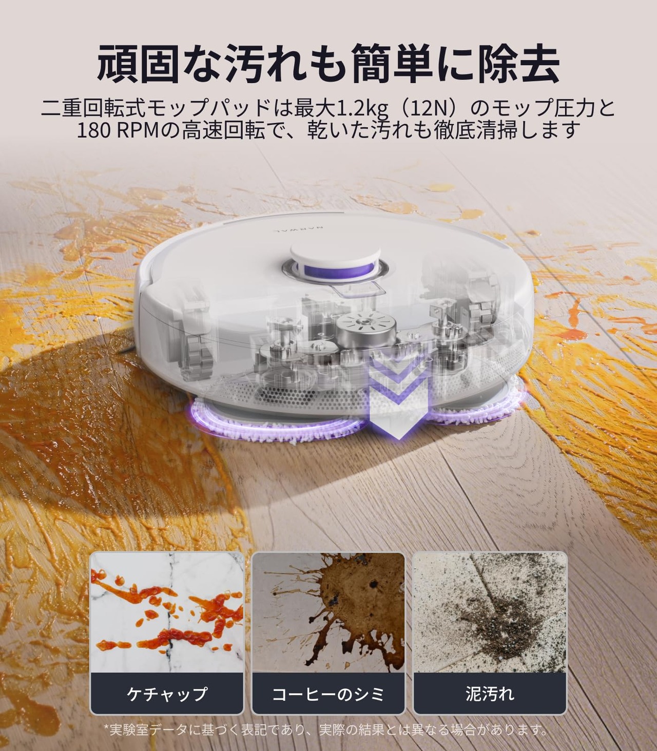 【強い圧力で頑固な汚れも簡単に除去】 Freo Pro お掃除ロボットはデュアルモップで1.2kg(12N)の強力な圧力をかけ、頑固な汚れも180RPMの回転速度で簡単に除去します。テールスイング機能により、清掃範囲が40%向上し、届きにくい床の隅、巾木、テーブルの下なども隅々までしっかり清掃します。また、革新的なルーロー三角形モップは床の100%をカバーし、見逃しのない設計となります。